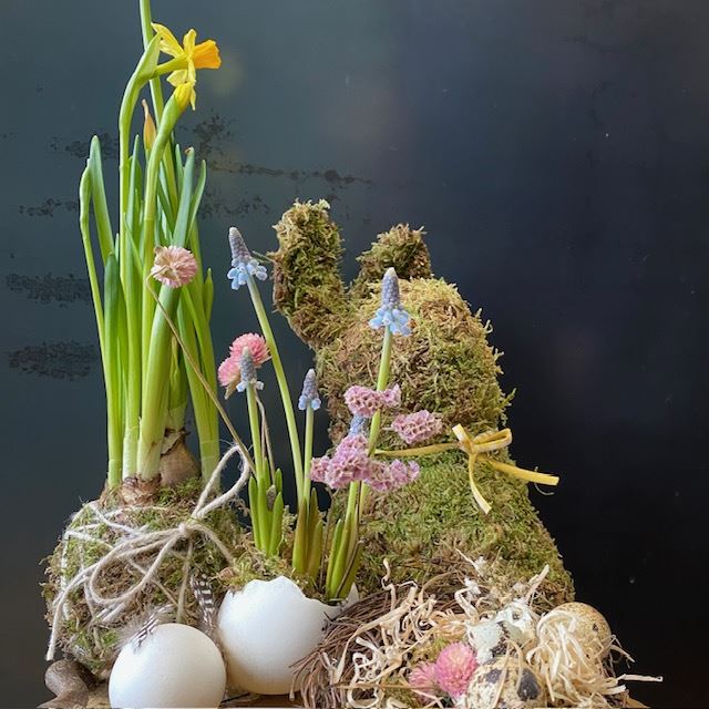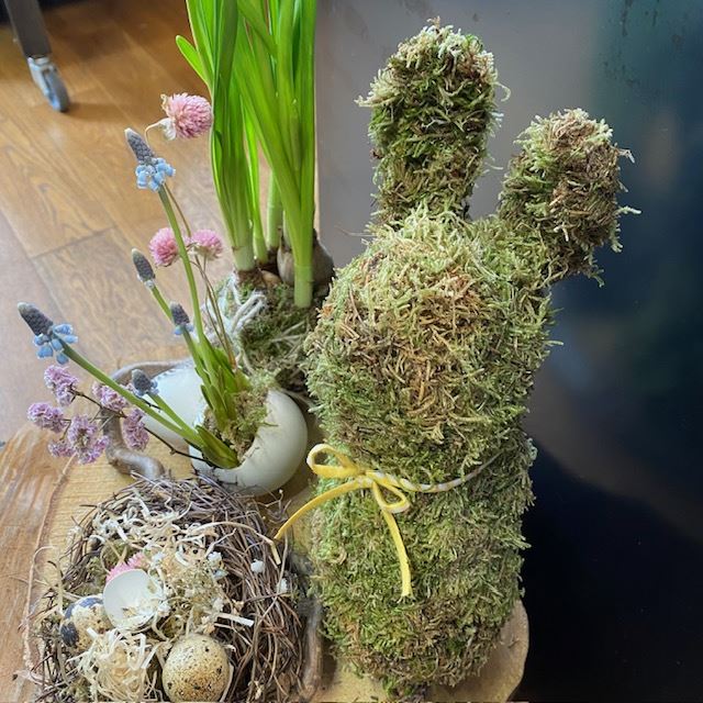 Divertente centrotavola a tema pasquale creato su una base di tronco di betulla con coniglio artigianale in muschio disidratato, un piccolo nido in viticcio con gusci d'uovo, bulbi fioriti, rametti e altri elementi decorativi.